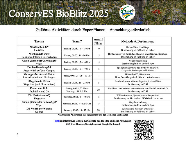 Anmeldung: Für die reguläre Teilnahme am BioBlitz (selbstgeführte Entdeckertouren, Ausstellung, Vortragsreihe) ist keine Anmeldung erforderlich, aber hilfreich für die Planung. Für geführte Aktivitäten bitten wir um Anmeldung (begrenzte Teilnehmerzahl), bei freien Pltzen ist auch eine Anmeldung vor Ort möglich. Link zur Anmeldung